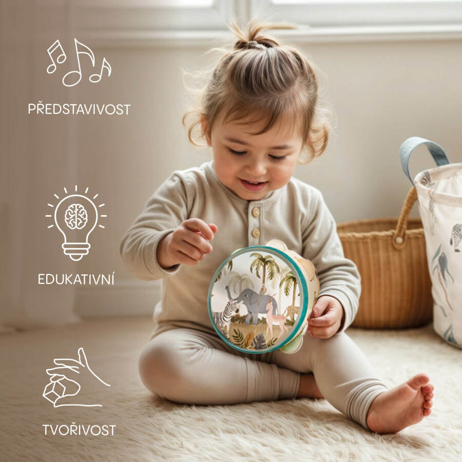 Tamburína je lehká, snadno uchopitelná a bezpečná i pro ty nejmenší. Díky své