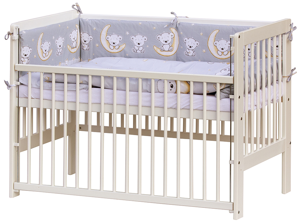 1. Dětská dřevěná postýlka 120x60 cm - bílá, masiv borovice, stahovací bok, 2 polohy roštu, nohy jsou předvrtané pro možné nasazení koleček
