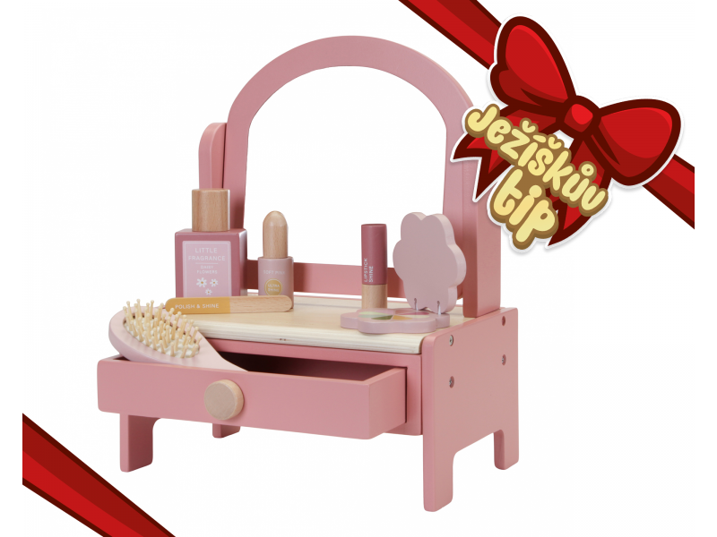 Toaletní stolek s doplňky v dřevěném provedení potěší malou parádnici a stane se i krásnou dekorací v dětském pokoji. Stolek je vybaven otočným zrcadlem, kartáčem na vlasy, parfémem, rtěnkou, očními stíny, pilníkem a lakem na nehty. Zásuvka je ideální pro uložení drobností.